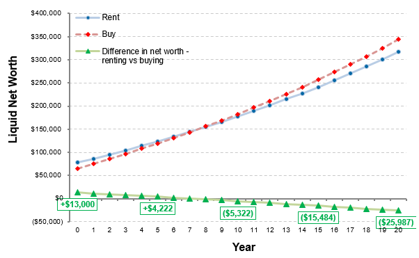 Adott példánkban, a bérleti szcenárió szerinti nettó vagyonérték 4 222 dollárral magasabb a vásárlásinál az 5. évben.